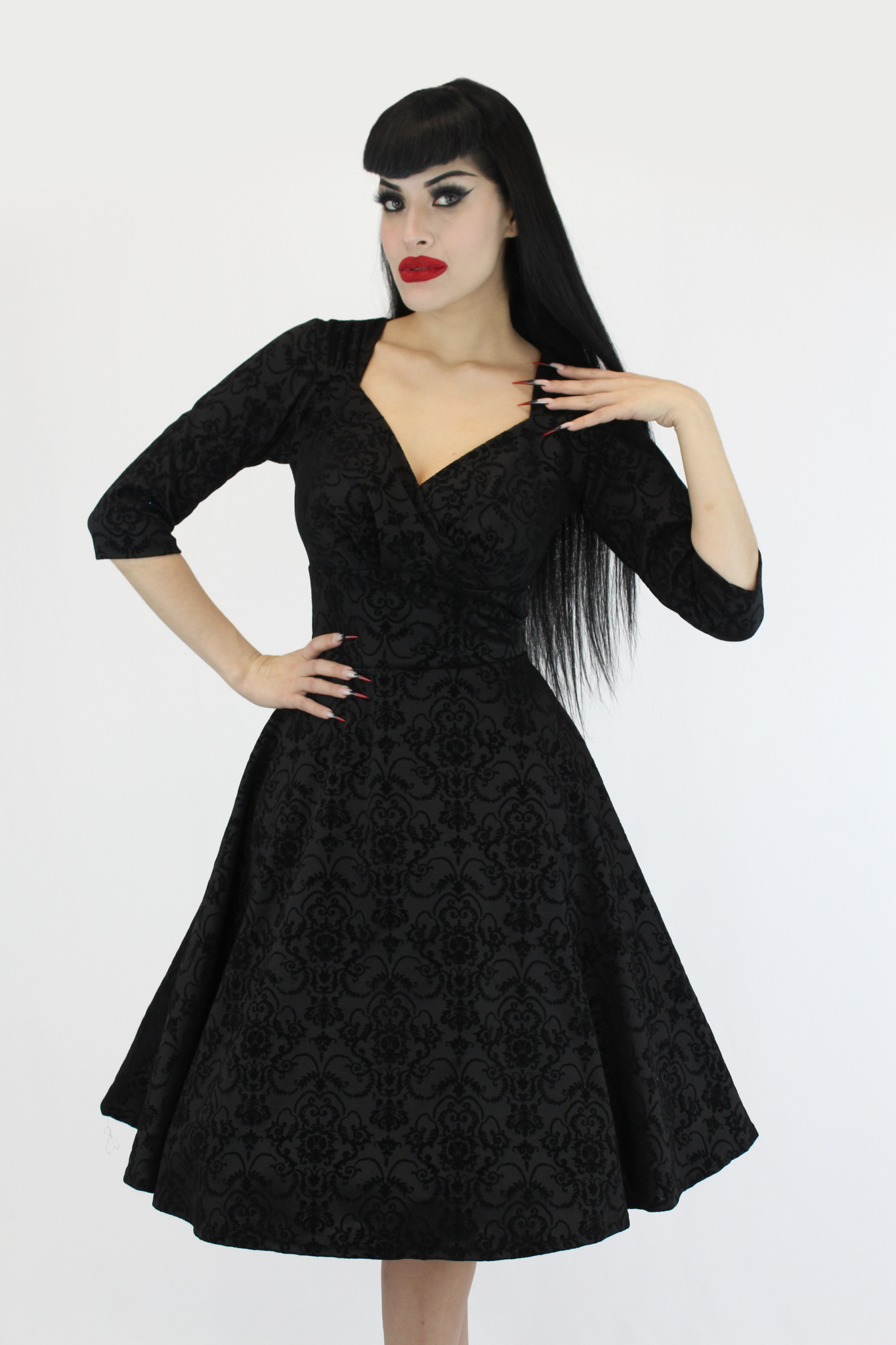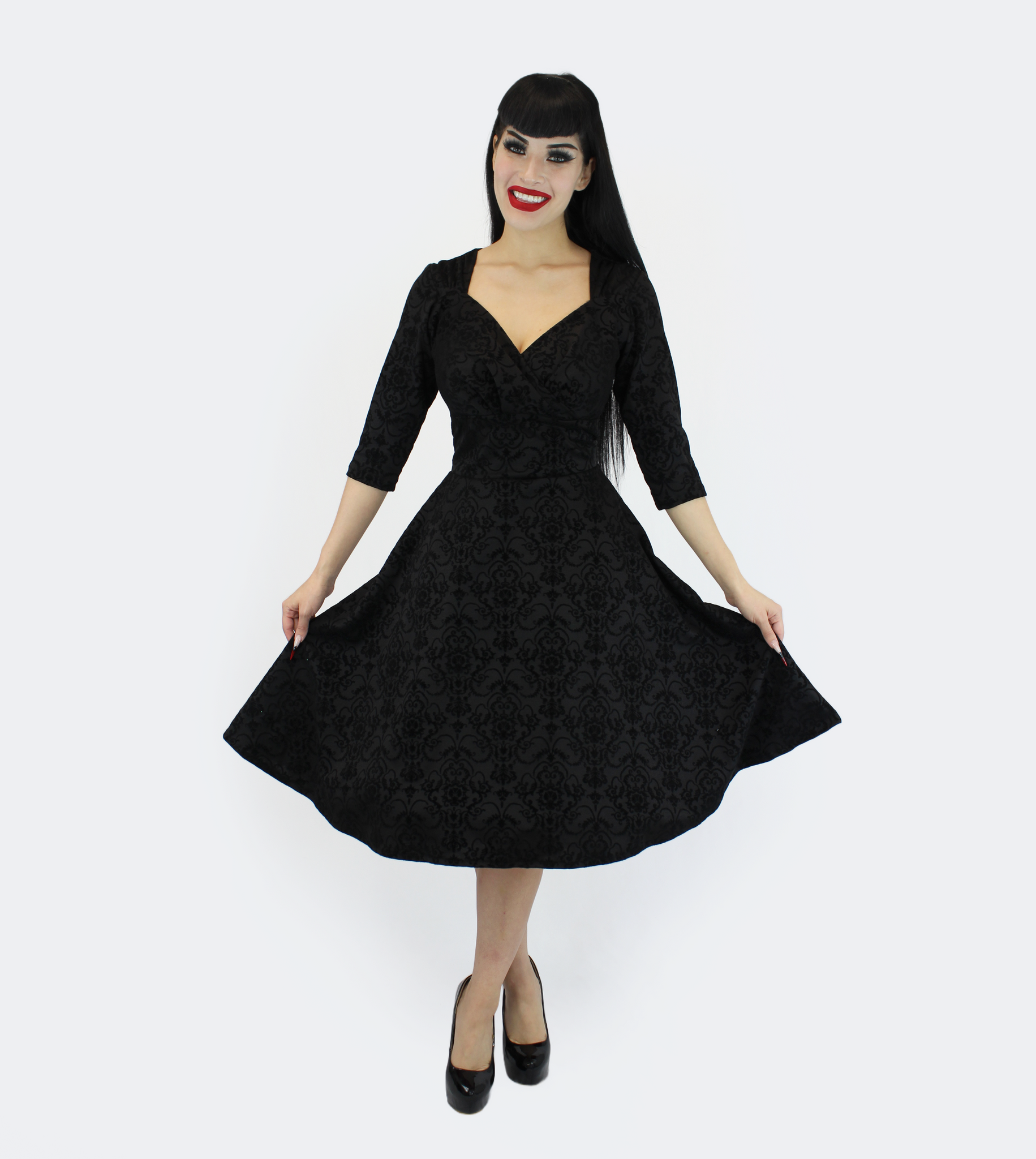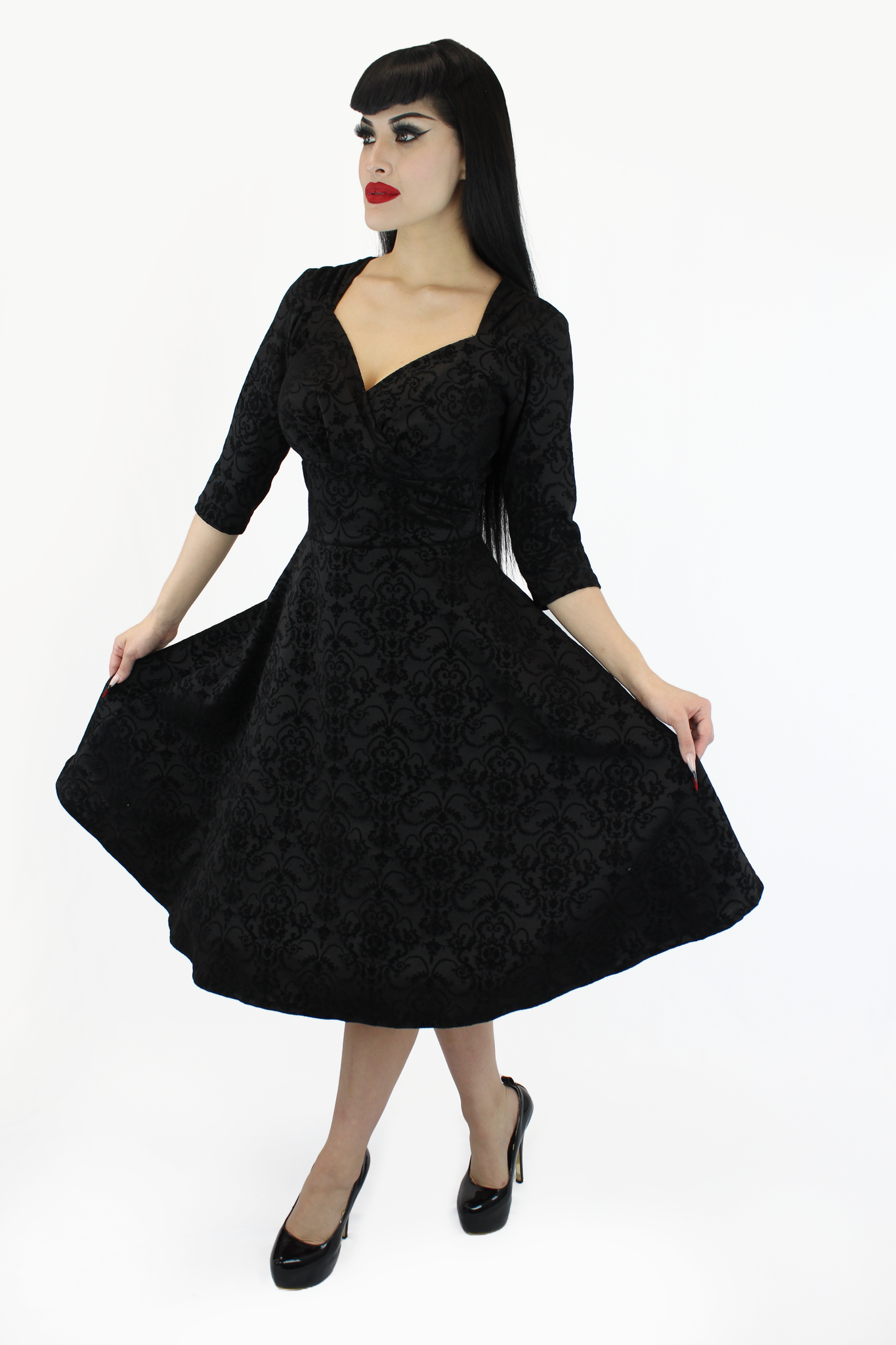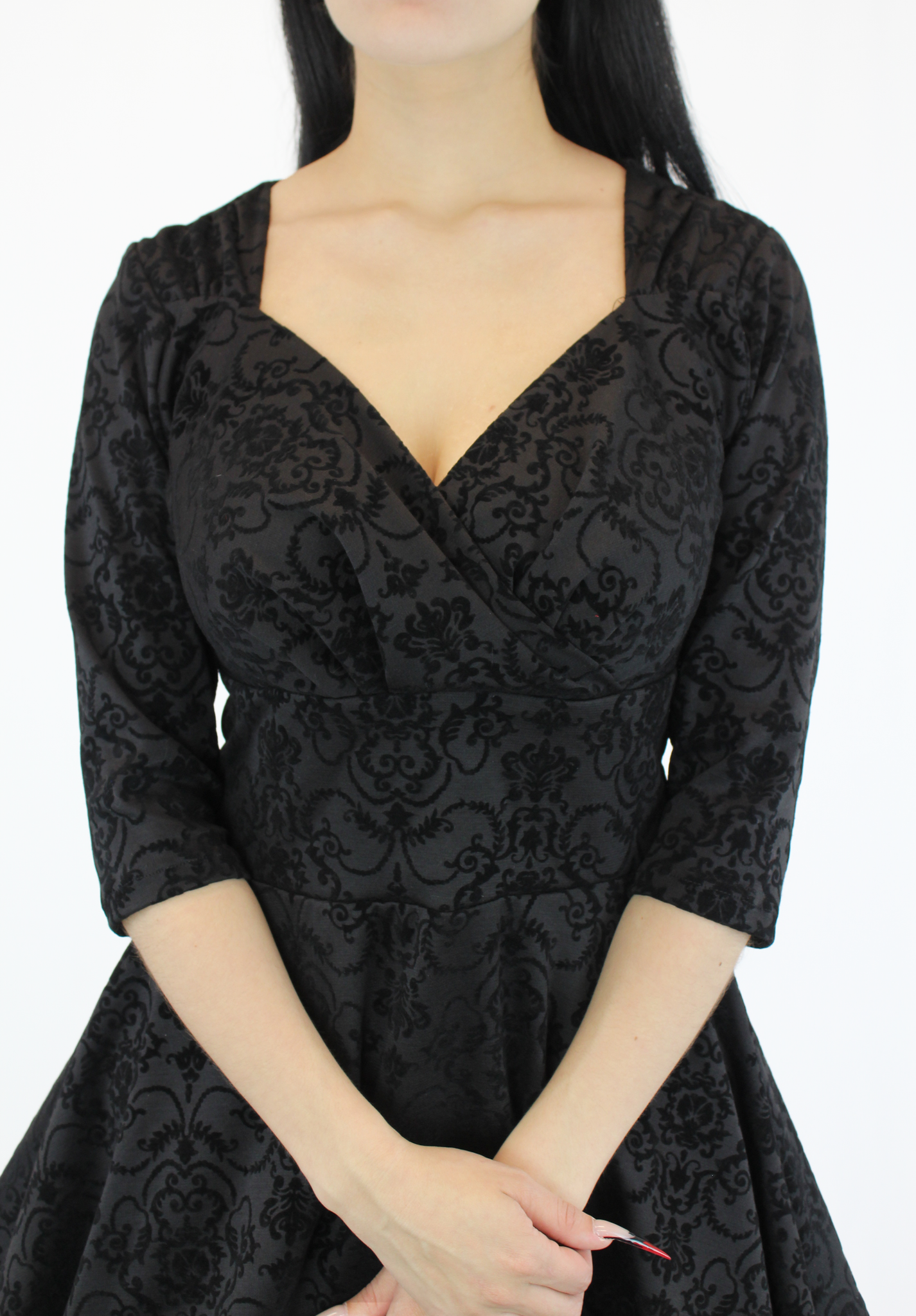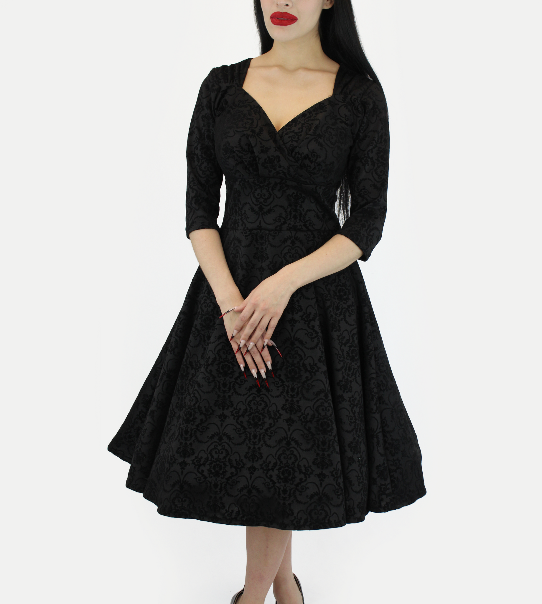 The conservative but flattering dress features ¾ sleeves, a surplice neckline that plunges at the front and curves at the back, cinched details at the shoulders, and a broad waistband, and pockets. The back appeal along with the fit and flare fit and velvety black damask design makes the dress a stunning dress for an elegant evening event.