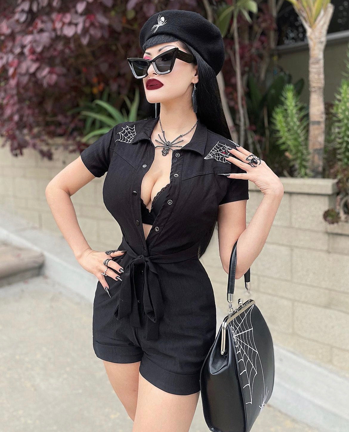 This embroidered spiderweb romper is designed with the perfect combination of fashion and comfort in mind! The stretchy fabric and belt cinch define the waistline for a flattering look!