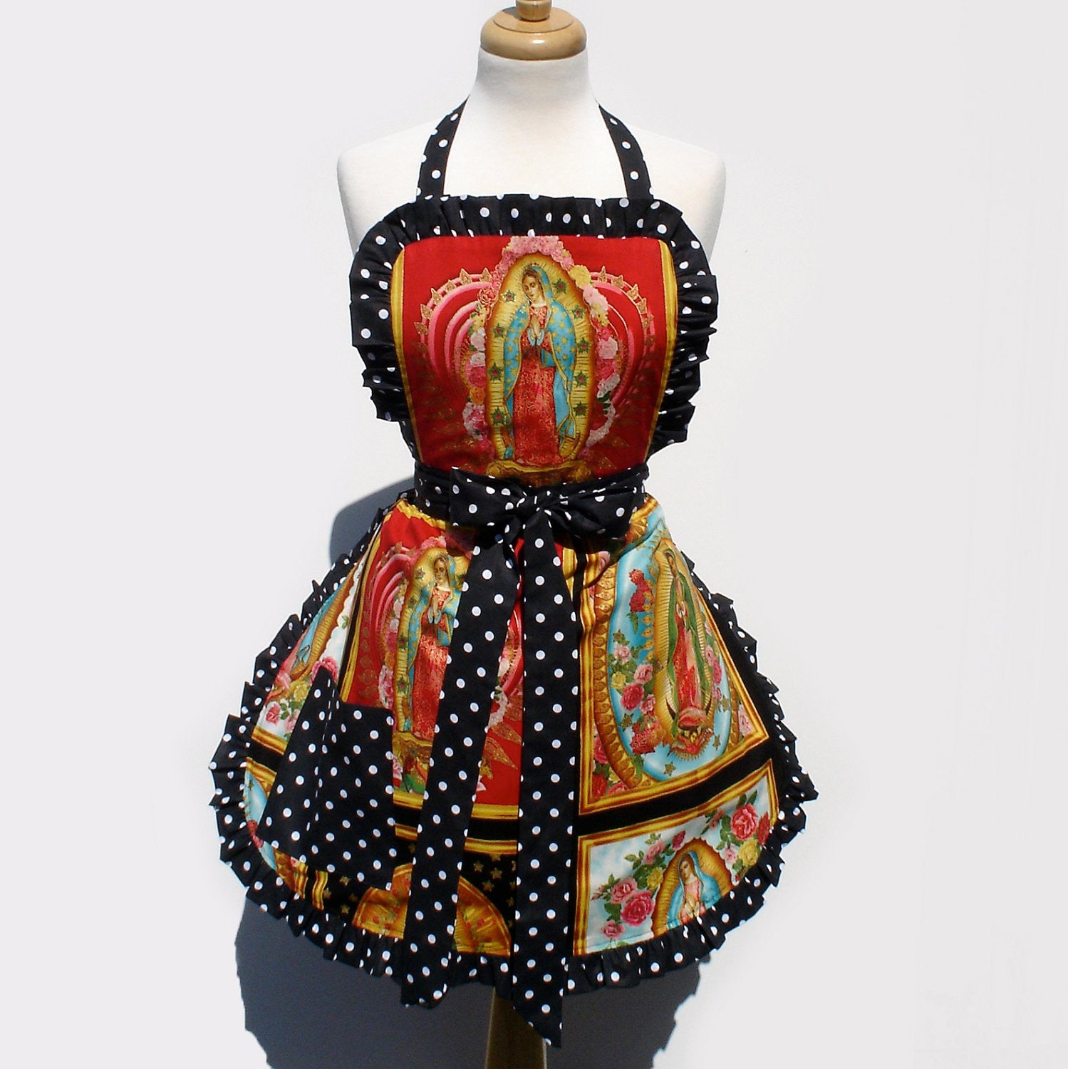 This apron is made from a Vivid Guadalupe Virgin Mary fabric. Vibrant Reds, Blues, Yellows, and Pinks combine to make this a truly exquisite piece. The print is composed of these beautiful detailed Guadalupe panels. A black with white polka dot trimming creates a the perfect contrast to this spectacular piece.
