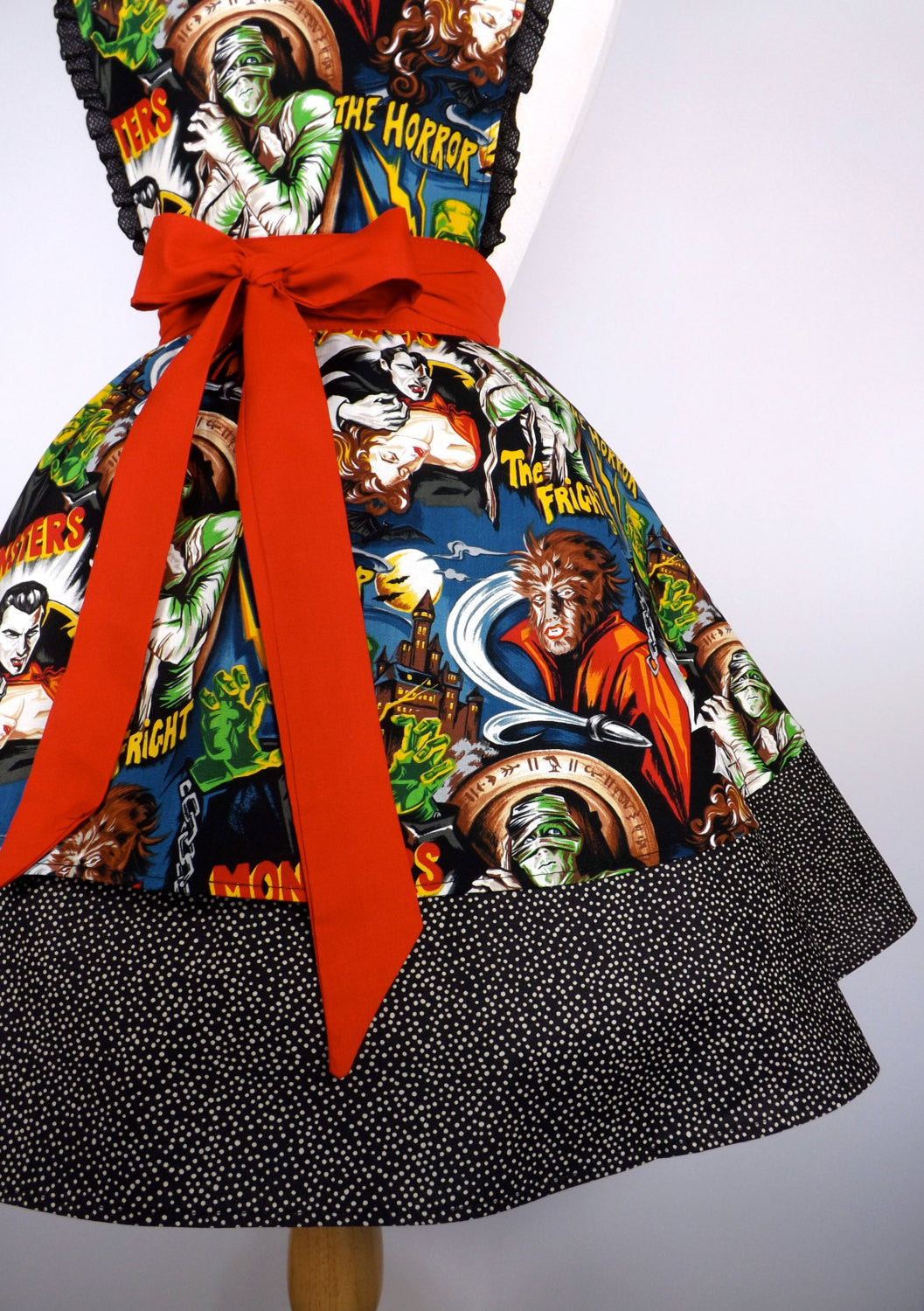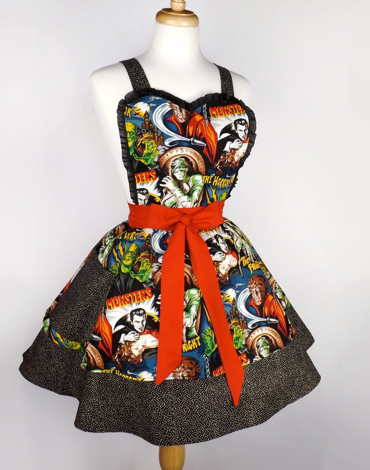 This two-tier apron is so very cute. Composed of a very fun fabric with The Mummy Dracula, The werewolf, and Frankenstein this apron has it all Two tiers make this a very darling piece with an A-line silhouette. The bottom layer has a black and cream polka dotted fabric. The belt is a red pop up color which makes this apron fully come to life. The chest is accentuated with black eyelet trim. This apron is feminine and screams rockabilly.