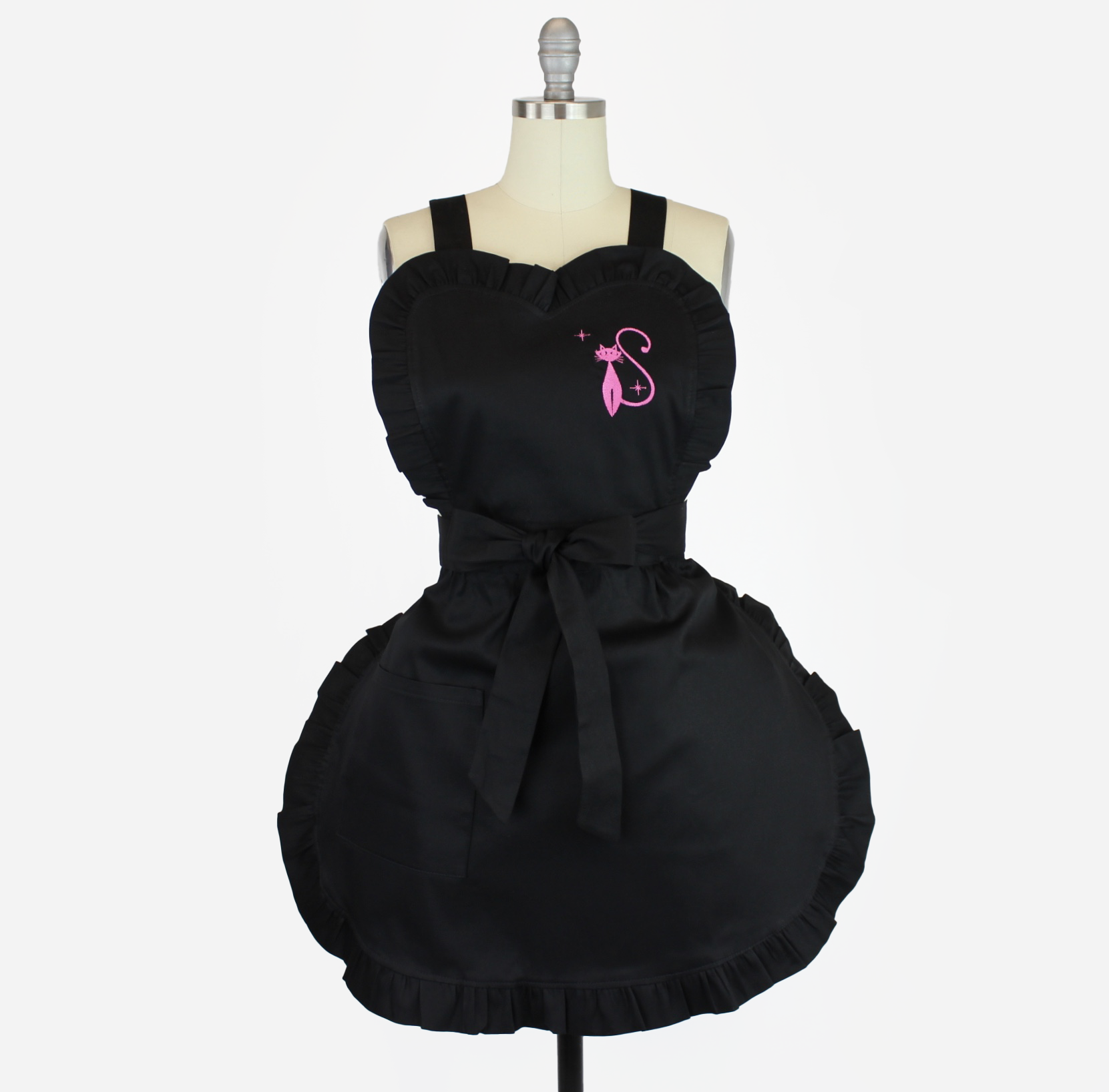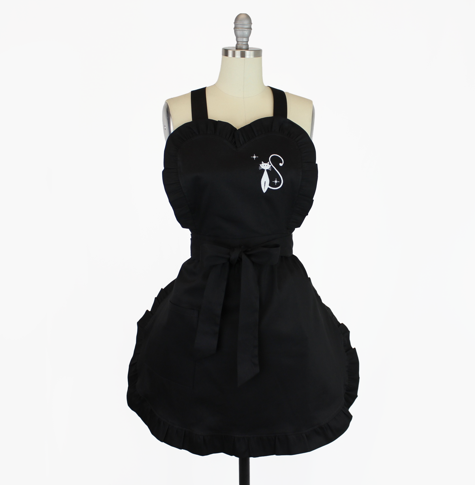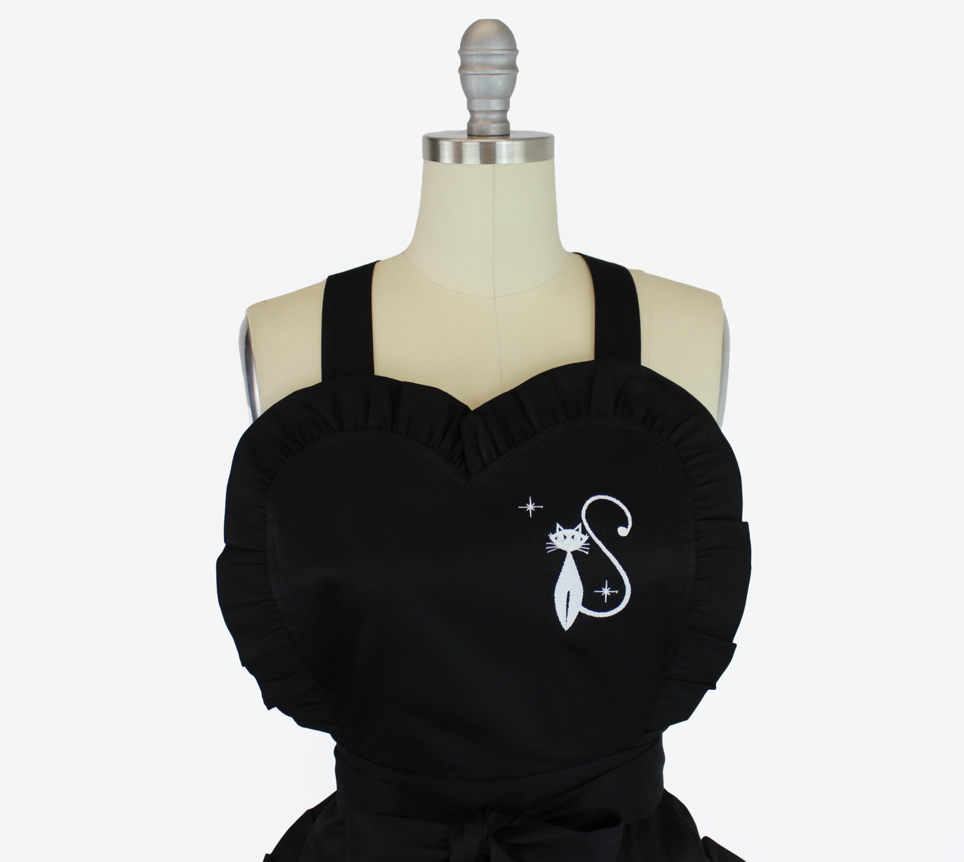 Retro 1950s White Embroidered Cat Black Vintage Inspired Apron