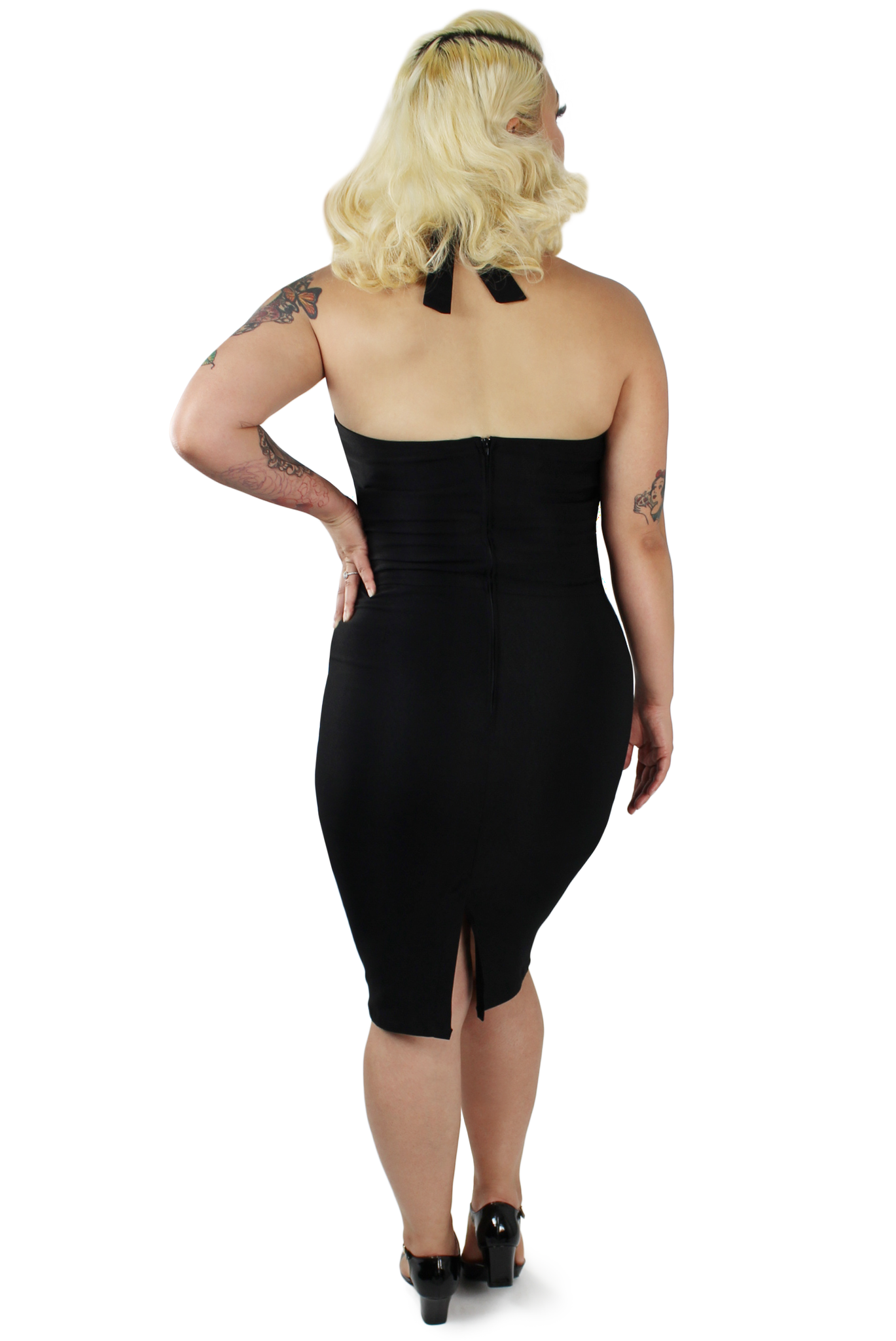 Slip into this black criss cross fitted dress! It fits like a glove and ties around the neckline either crossed or simply as a halter. The option is yours.