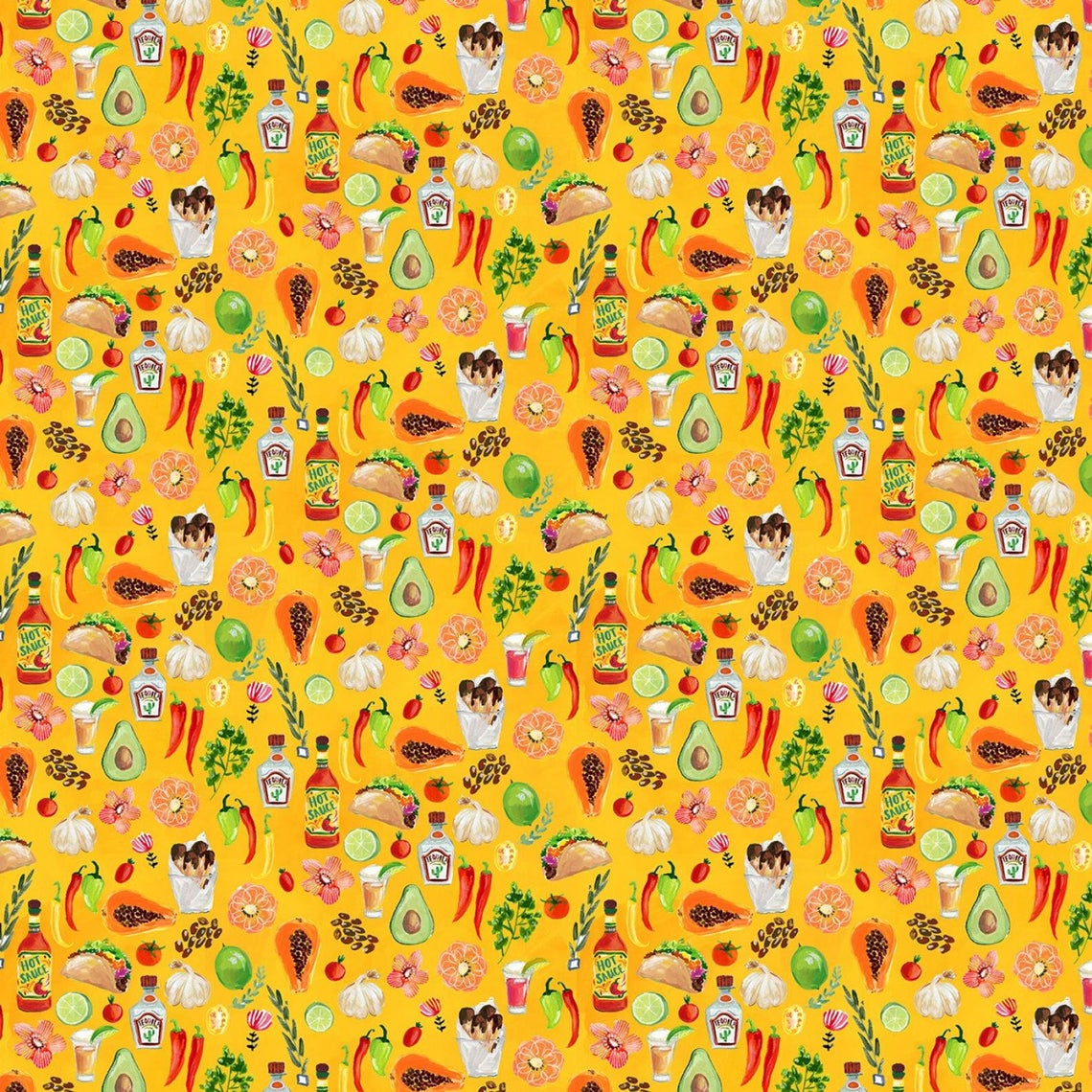 An assortment of food and drinks come together in this colorful face mask! Perfect to wear on Mexican independence day and home parties.