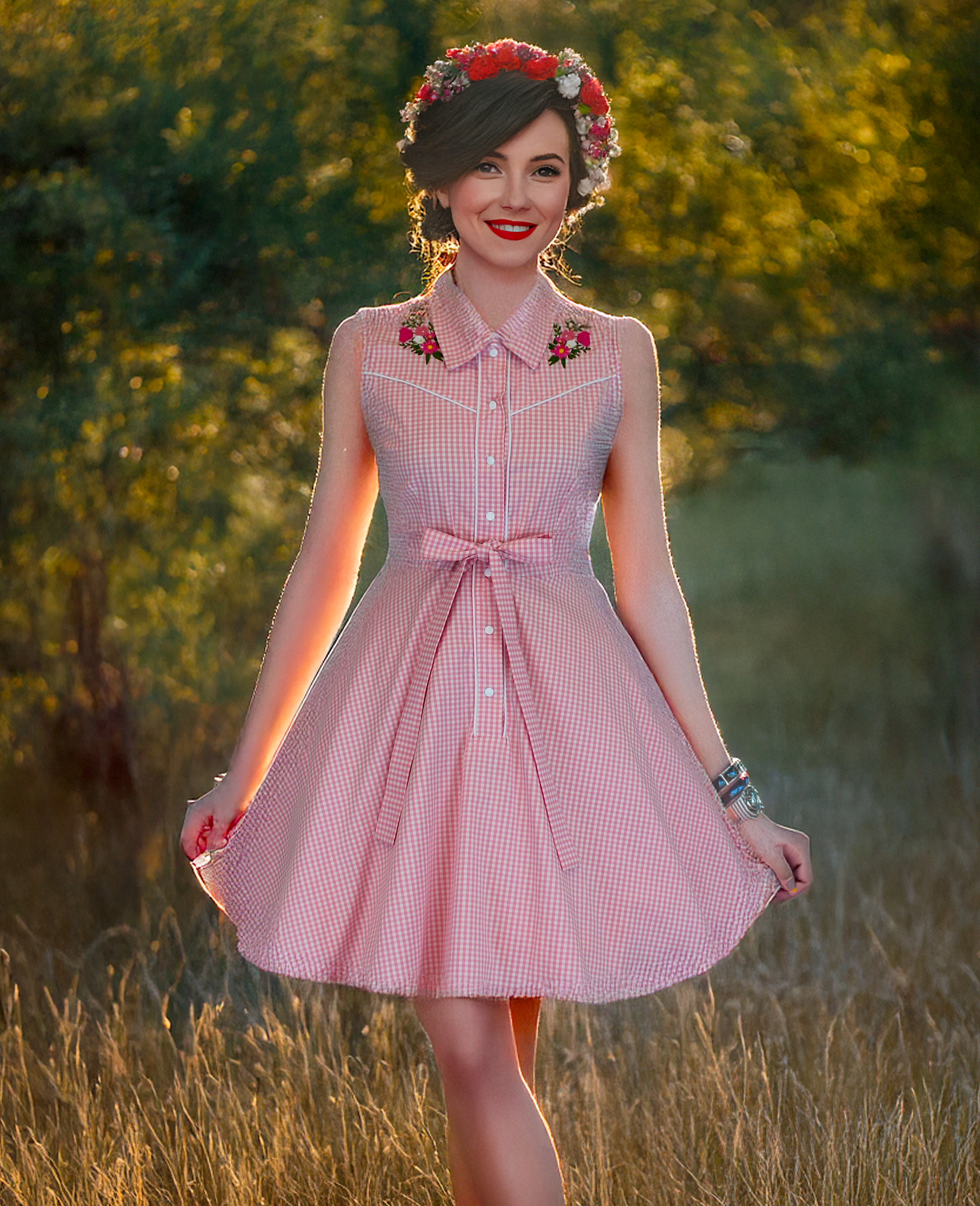 Make a statement in this Pink Gingham Sleeveless Dress, a charming fusion of 1950s retro flair and classic rockabilly pin-up style. Featuring delicately embroidered floral bouquets and a flattering A-line silhouette made for twirling, this dress brings the sweet, nostalgic vibe of vintage summer fashion to life.