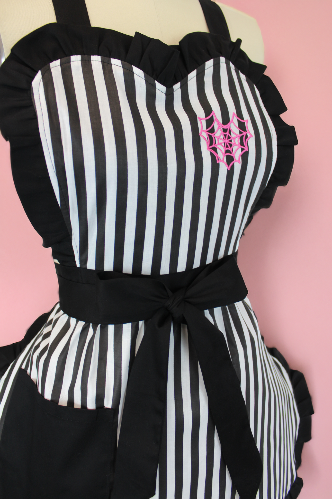 Enjoy this super cute black and white striped apron featuring a sweetheart neckline, black neckties, belt, pocket, trim, and embroidered pink heart shaped spiderweb!