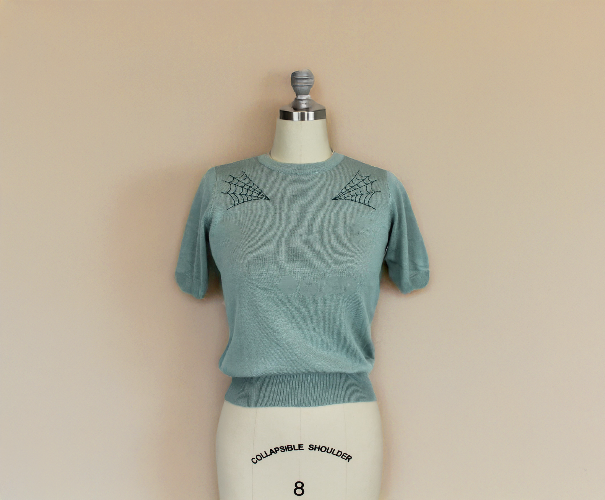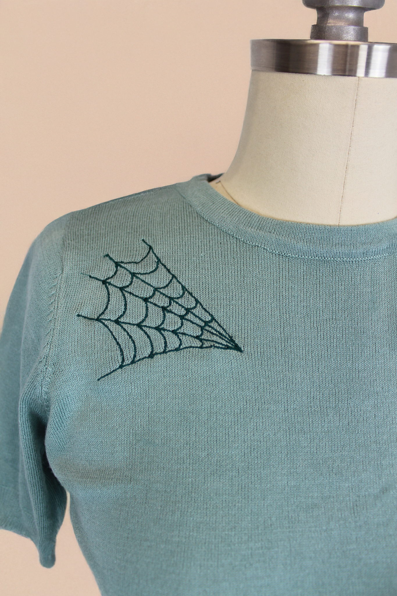 Crafted in a soft, lightweight knit, this shorter sleeve pastel sage top features delicate embroidered teal, spiderweb details at each shoulder, giving it a subtly spooky, retro-inspired feel.