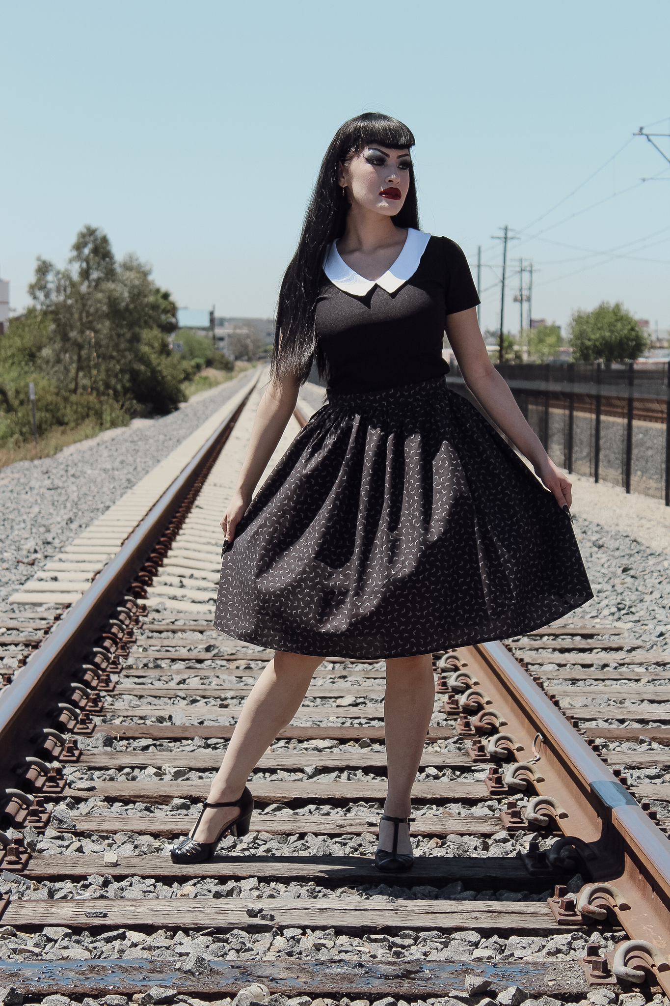 Model wearing black top with white collar
