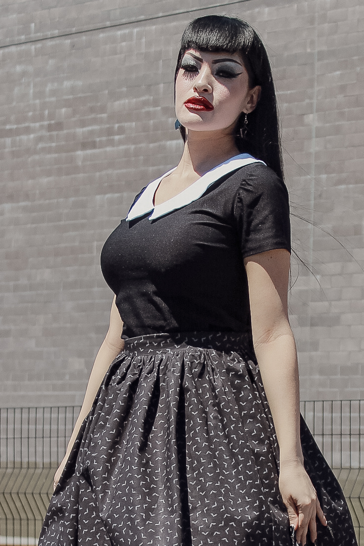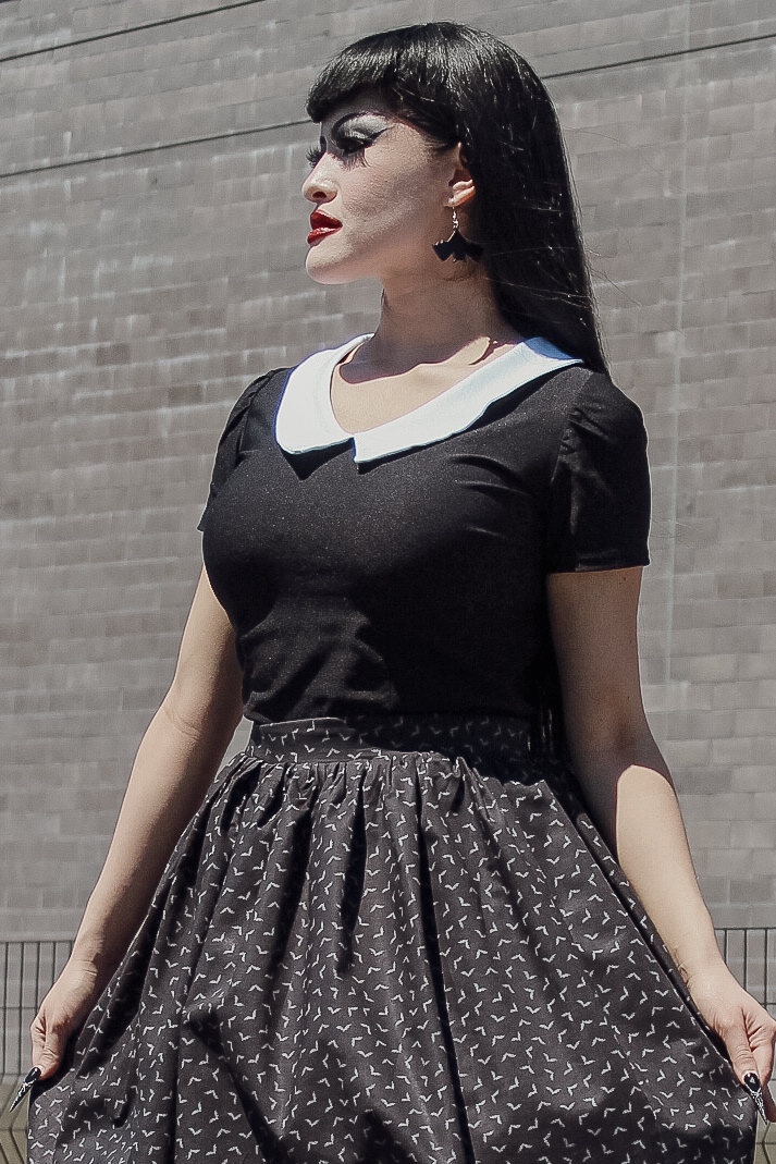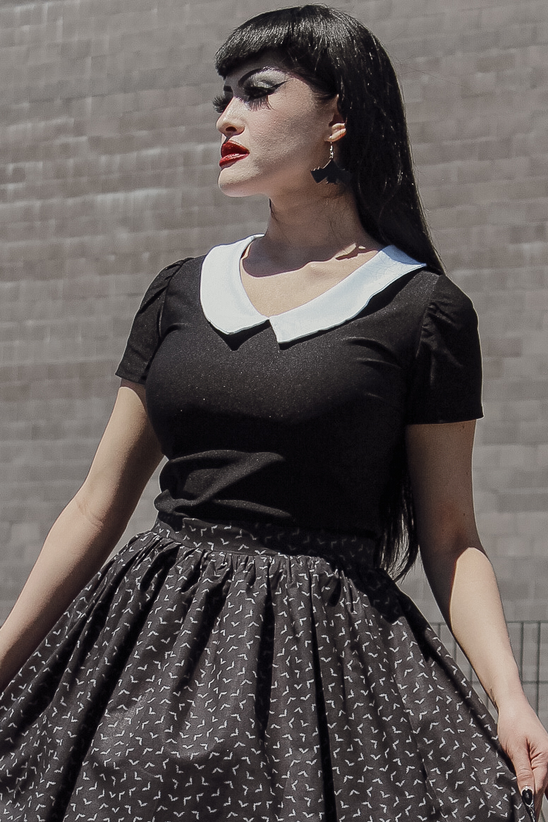Our fitted Wednesday inspired top was redesigned! It has no zipper and up to 5 inches of stretch. Not only is it an all time classic to pair with pants and skirts, but it is now extra comfortable. Wear every other week especially on Halloween!